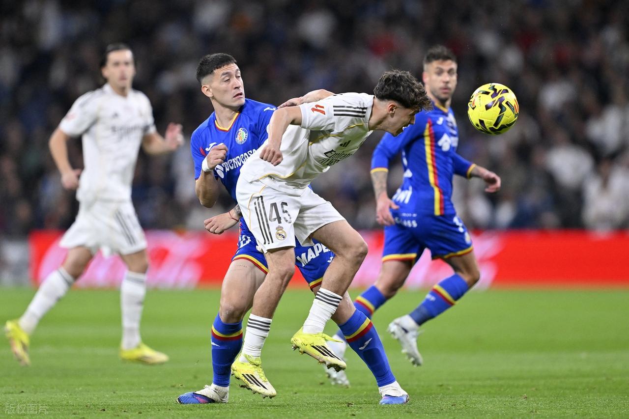 易边再战落后的皇马展开猛烈反扑,第51分钟,贡萨洛禁区内背身回做,19岁小将皮塔克禁区弧顶左侧迎球推射,这球力度和角度都不行,索里亚稳稳将球扑住。随后皇马这边换人调整,皮塔克,阿拉巴和阿诺德被换下,罗德里戈,郝伊森和卡瓦哈尔替补登场。第61分钟,皇马右侧角球机会,吕迪格争抢中摔倒在地,主裁没有吹罚点球。第76分钟,皇马又是右侧角球制造机会,吕迪格小禁区内超近距离抢点甩头攻门,皮球几乎是擦着门柱出了底线。补时阶段,着急上火的皇马球员上演输人一幕,替补登场的马斯塔托诺怒喷裁判,直接领到一张红卡。1分钟后赫塔菲和主裁也给个面子,利索哨响后踢球吹到第2张黄牌,2黄变1红也被罚下场。最终皇马苦攻无果,主场0:1爆冷输球,遭遇2连败。
